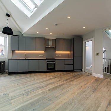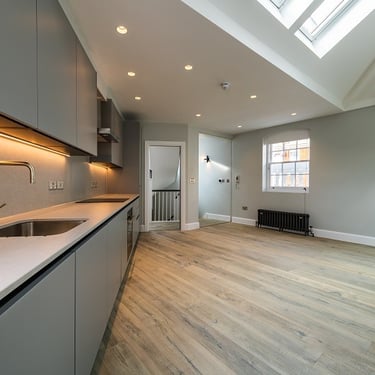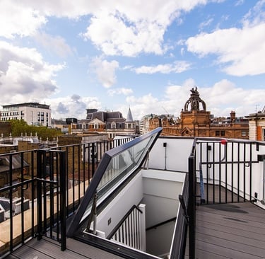 This remarkable Leicester Square property renovation transformed an underutilised loft into a stunning rooftop balcony with sweeping views over London. With the project’s ambitious scope, Fallon & Co Builders installed a custom roof access point, optimized the structure for natural light, and completed a bespoke staircase illuminated with integrated lighting.